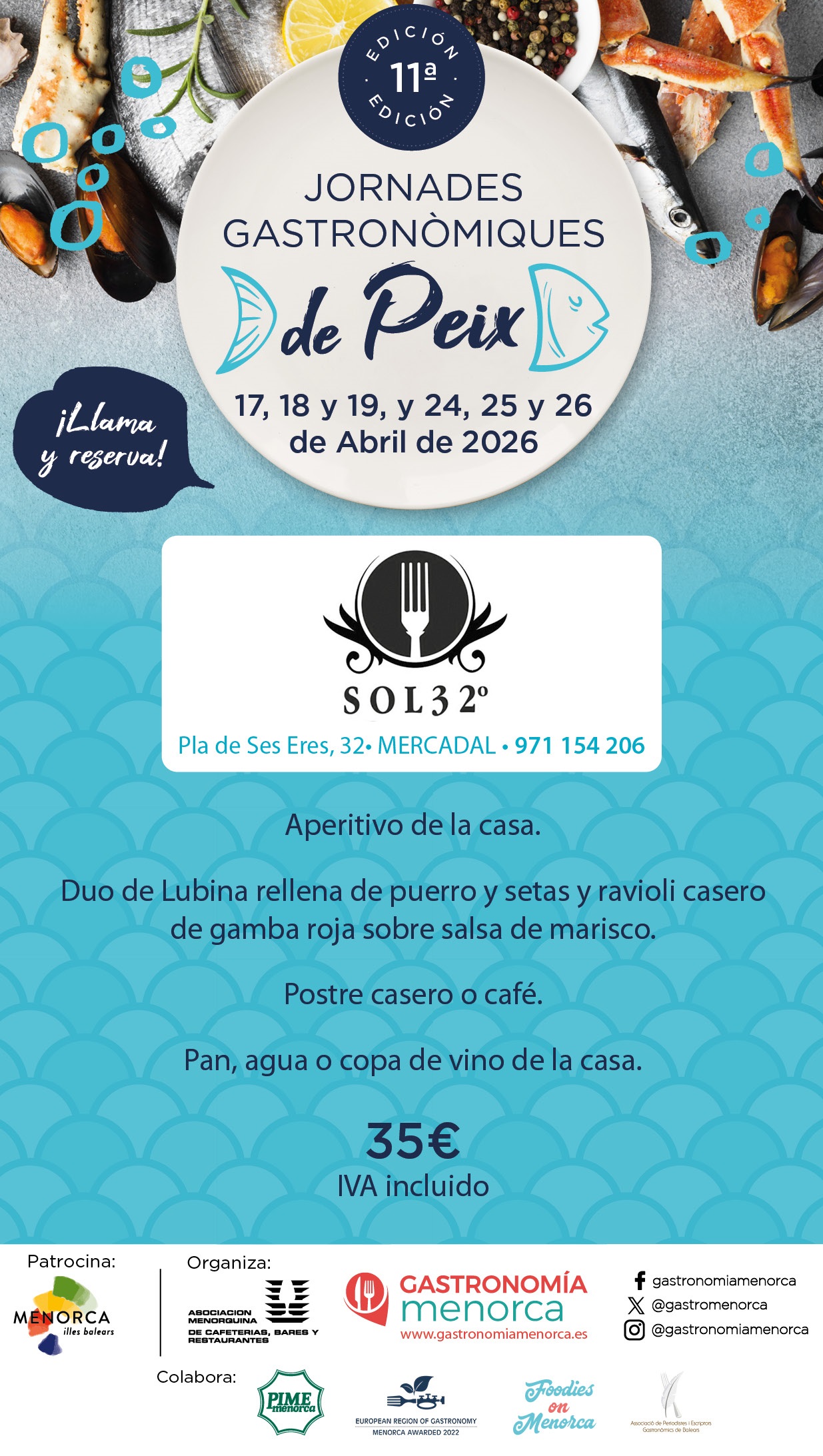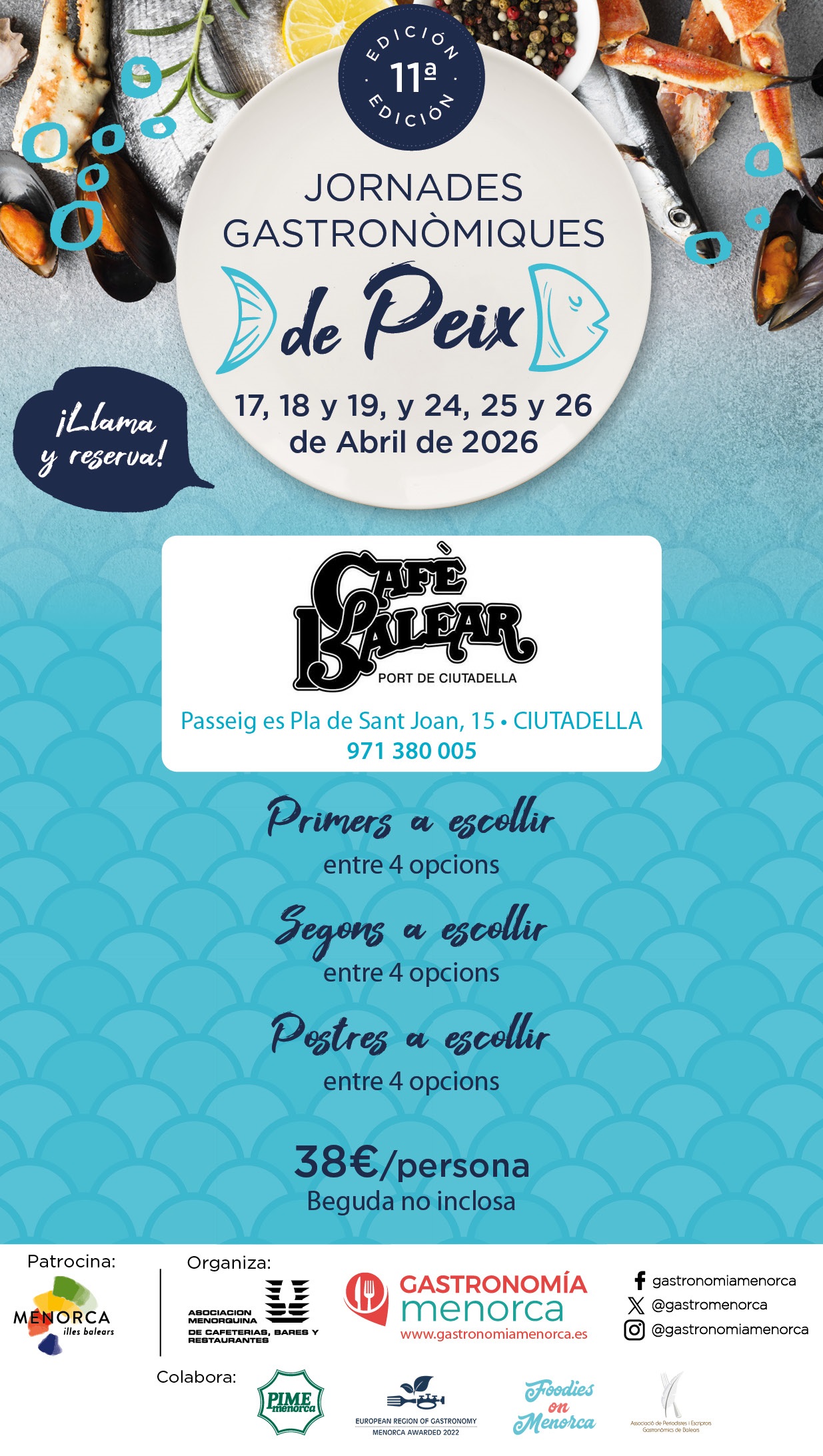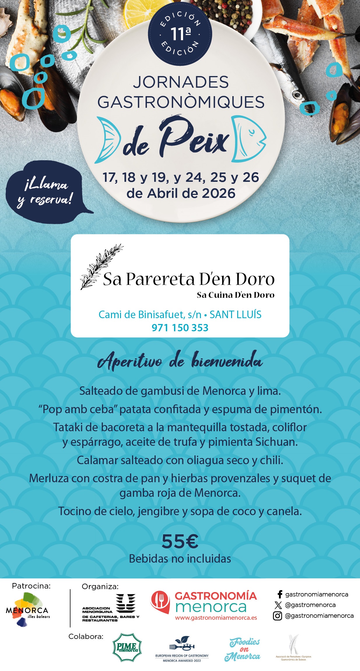 Los restaurantes adaptarán el menú a la disponibilidad del producto fresco. Se recomienda reservar previamente y consultar la información actualizada a través de www.gastronomiamenorca.es