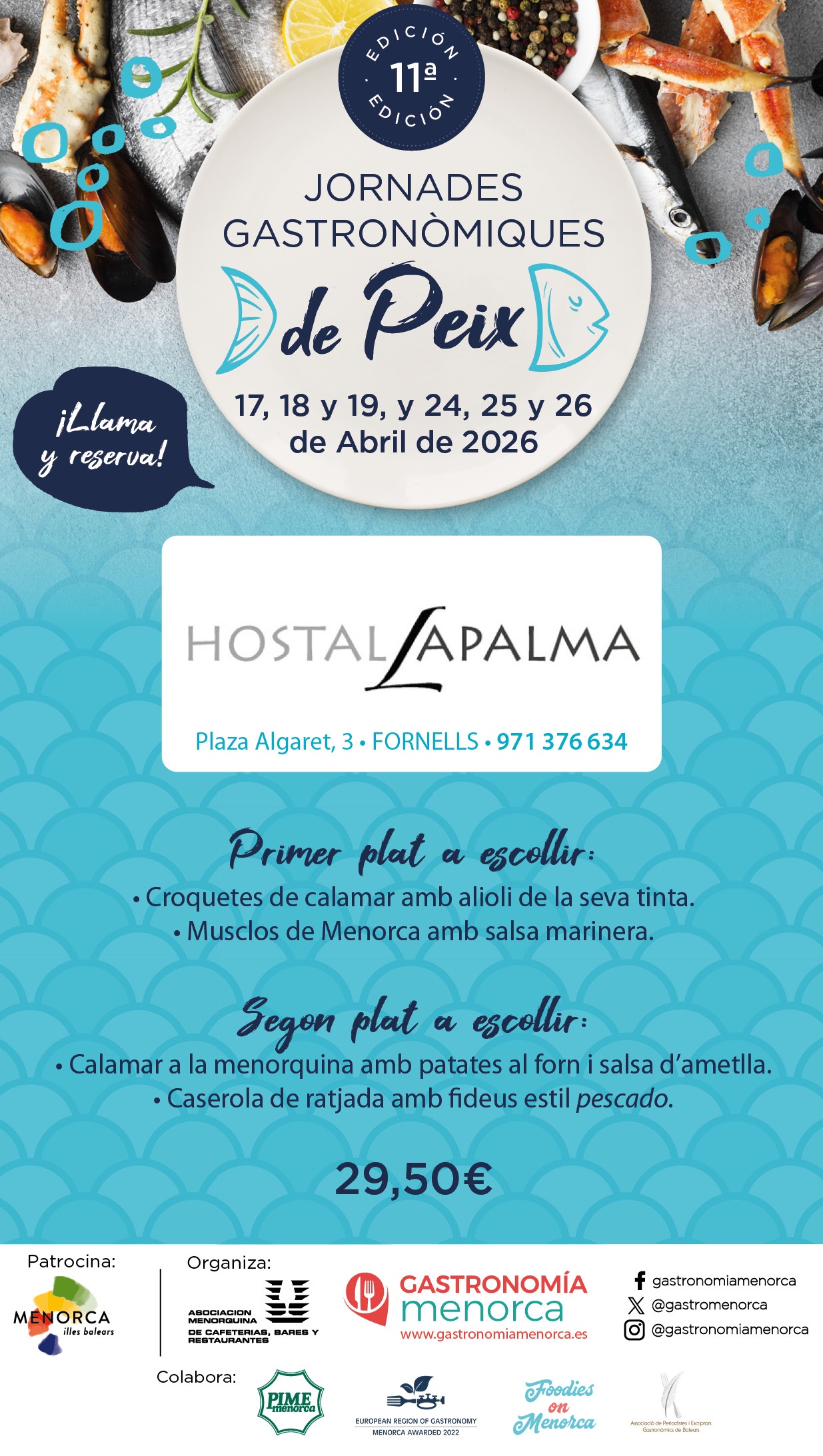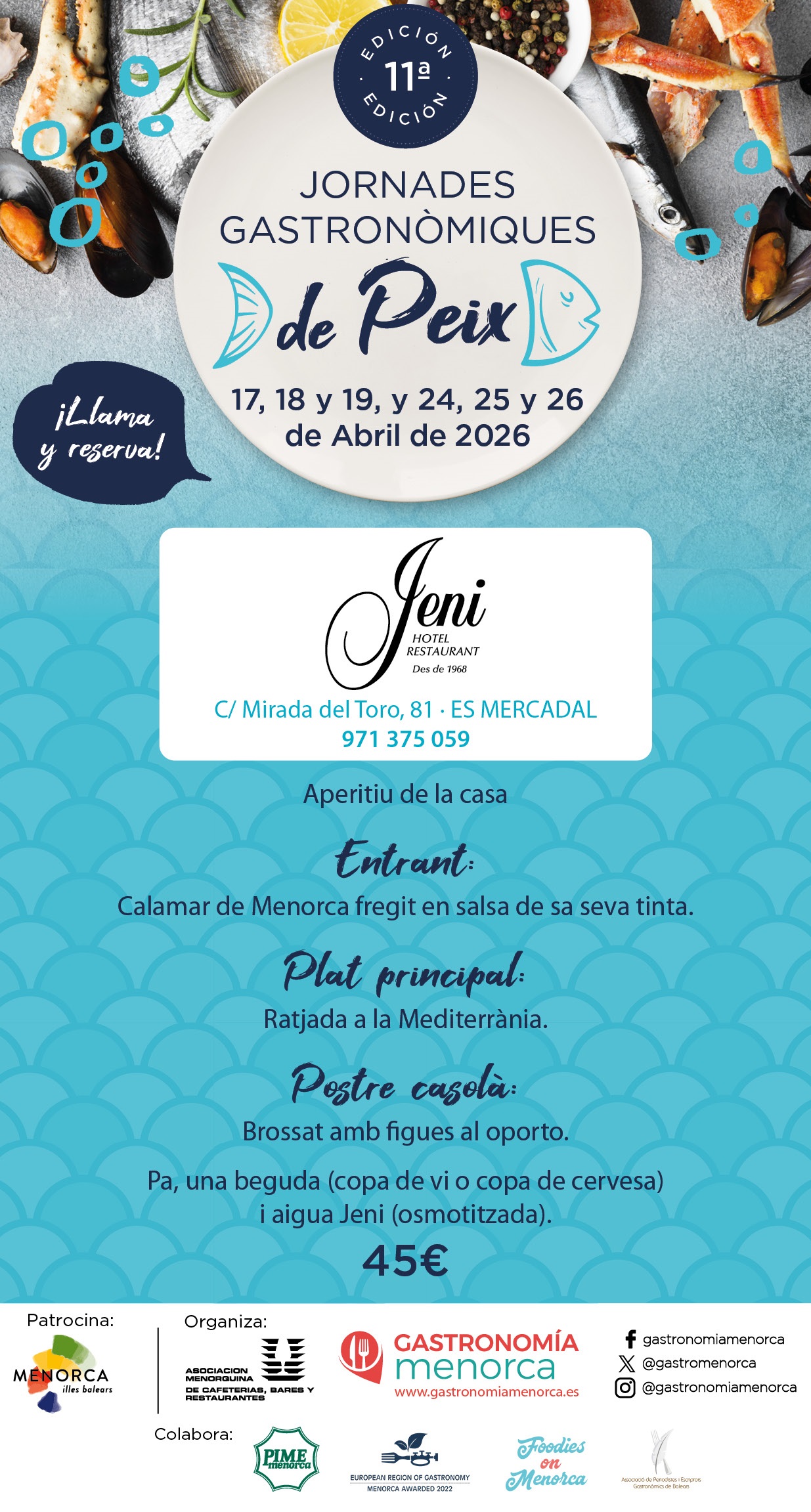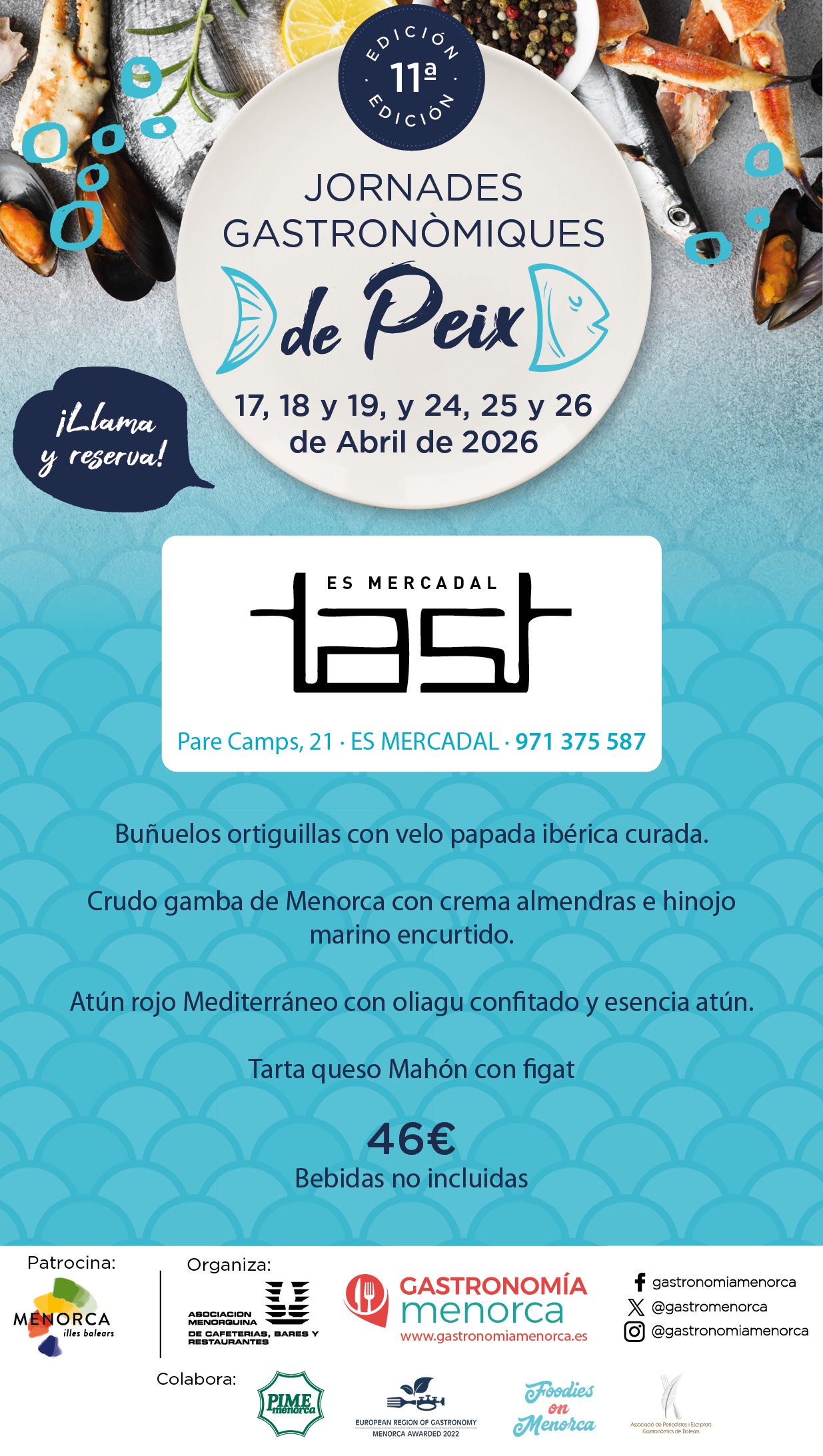 Los restaurantes adaptarán el menú a la disponibilidad del producto fresco. Se recomienda reservar previamente y consultar la información actualizada a través de www.gastronomiamenorca.es